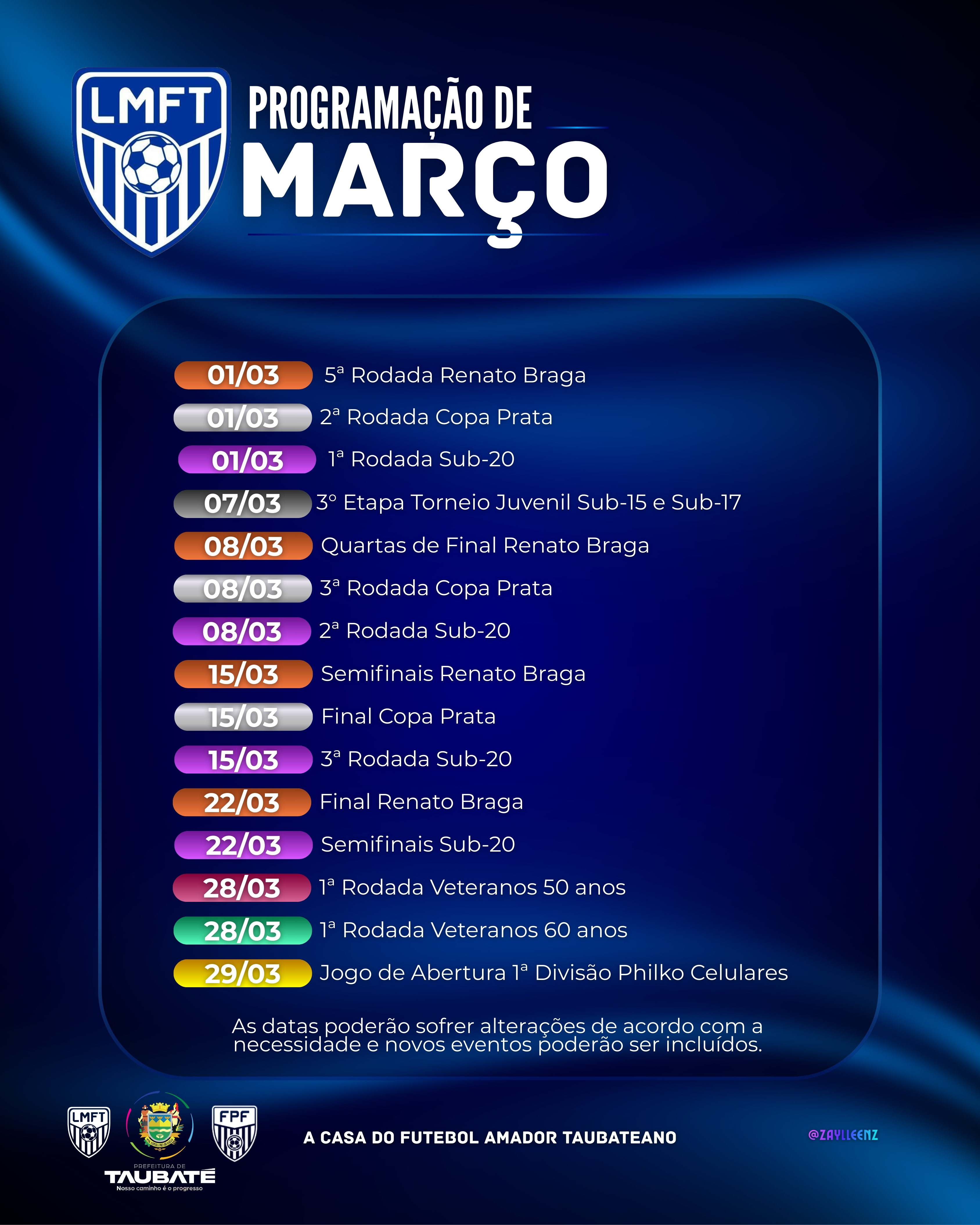 Que energia boa para começar março! Vai ser um mês cheio de bola rolando e emoção: Sub-20 abrindo hoje, os campeonatos veteranos de 50 e 60 anos trazendo experiência em campo, a 1ª Divisão Philko Celulares iniciando com jogo de abertura e ainda a final da Copa Prata e Renato Braga se aproximando.